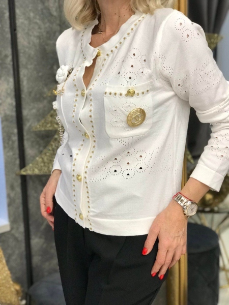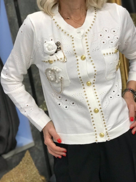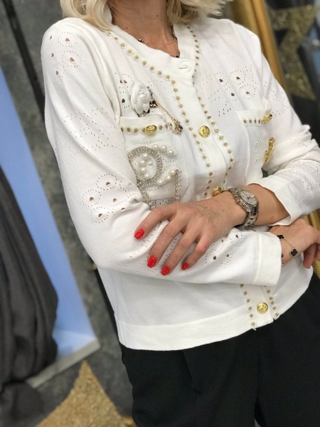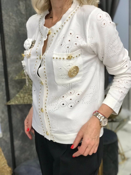Жилетка в бял цвят от фино плетиво. Моделът е със свободен силует и се закопчава с копчета. Размерът е универсален и е подходящ за S, M.