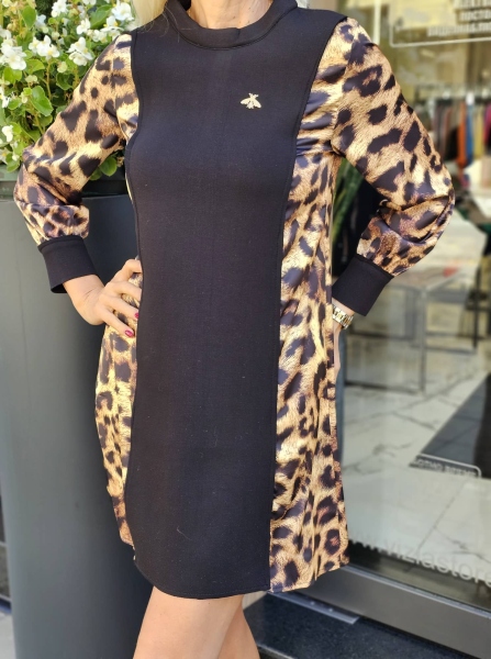 Рокля с дължина над коляното със свободен силует. Моделът се закопчава с цип.