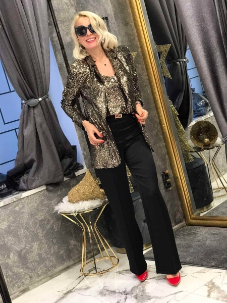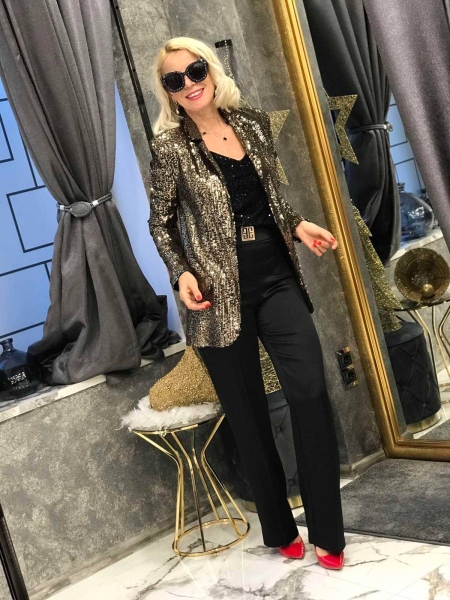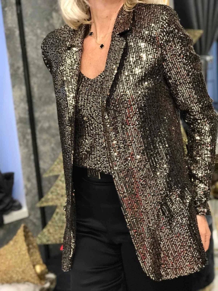 Сако с права кройка изцяло декорирано със златисти пайети. Моделът е без закопчаване.