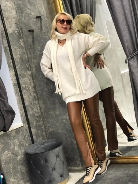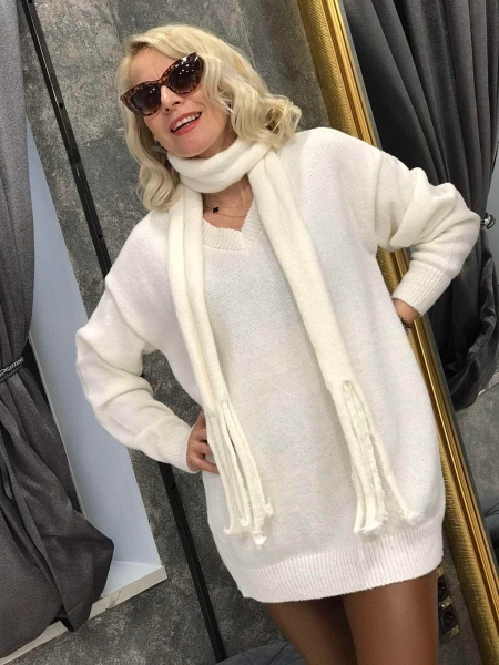 Пуловер със свободна кройка и аксесоар шал към него. Размерът е универсален и е подходящ за M, L, XL.