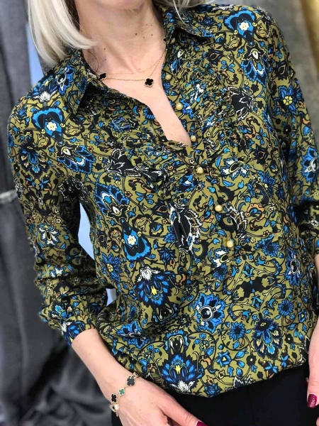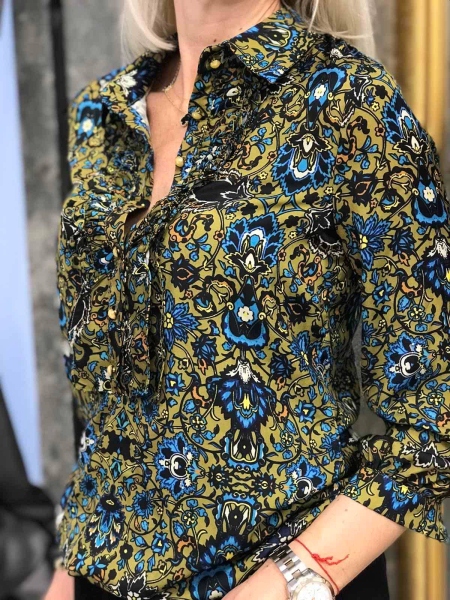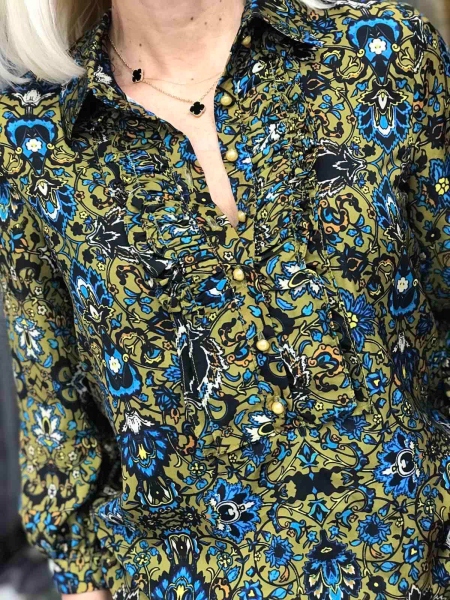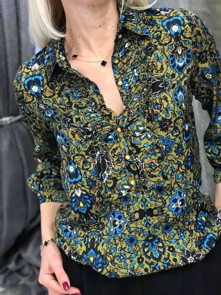Риза от тънка материя с жабо и 7/8 ръкави. Моделът се закопчава с копчета и е на ластик в долната си част.