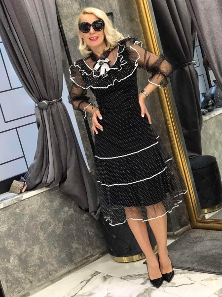 Рокля от тюлена материя в черно на бели точки. Моделът е с втален силует и се закопчава с цип.