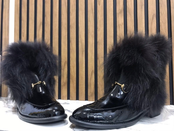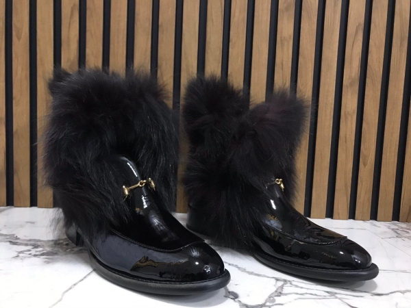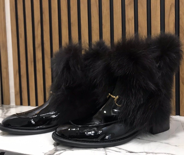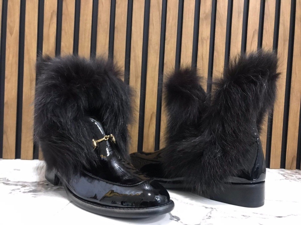 Боти с равна подметка от естествен лак. Моделът е декориран с естествен пух. Обуват се без закопчаване. От вътрешната страна са с топла подплата.