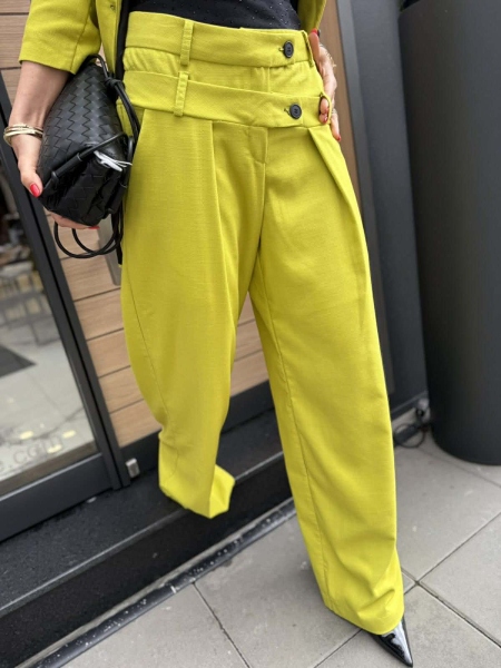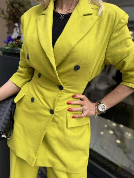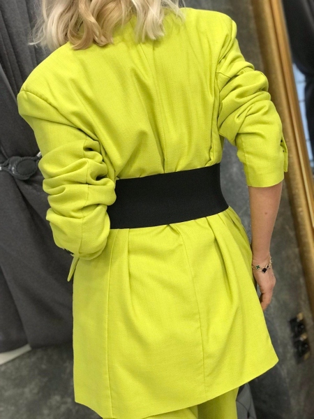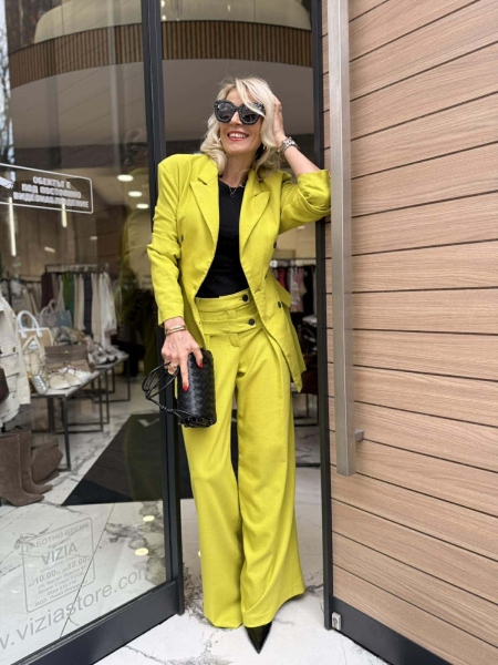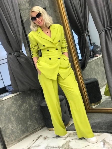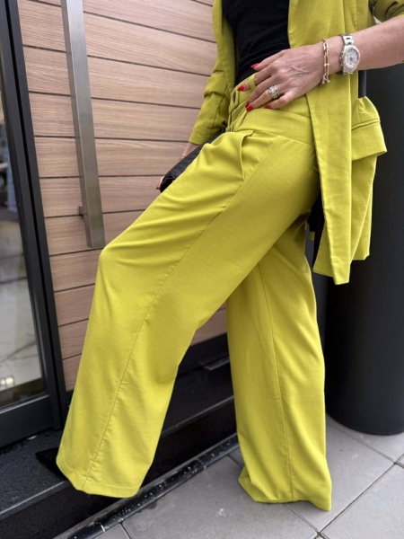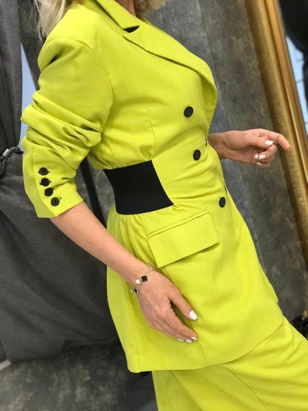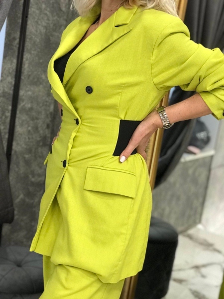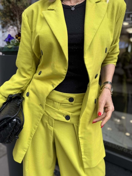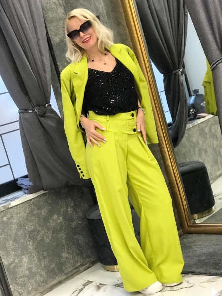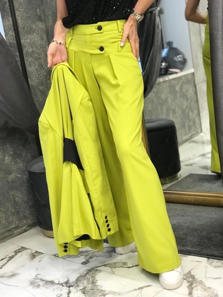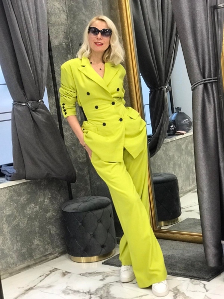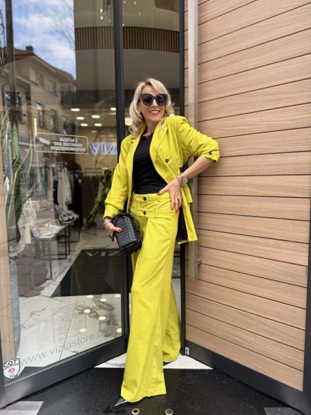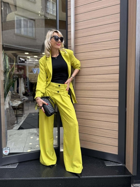 Сет сако с панталон в неонов цвят. Сакото е издължено с втален силует. Панталонът е с много широки крачоли.
