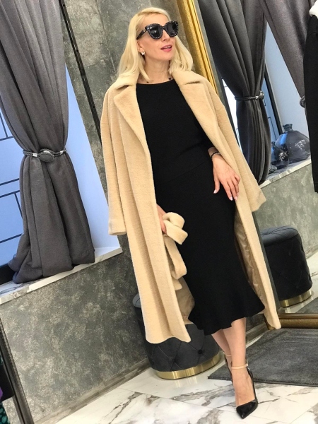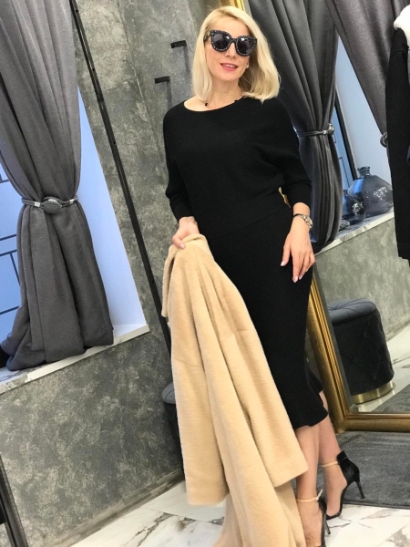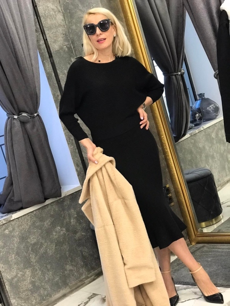 Комплект от финно плетиво, блузата е с реглан ръкав, а полата с удължена дължина и има ластик в талията. Размерът е универсален и е подходящ за S и М.