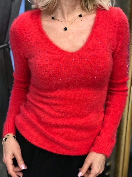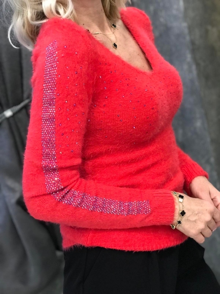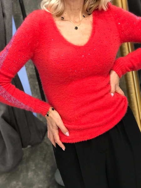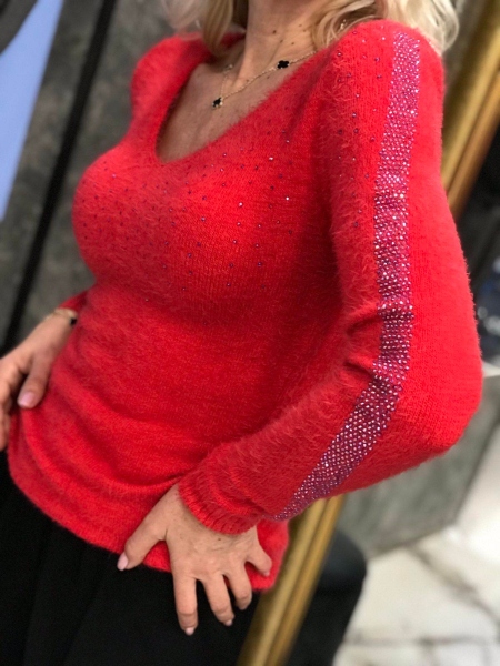 Пуловер от мека и топла материя в неонов цвят с декорация от камъни. Моделът е с втален силует. Размерът е универсален и е подходящ за S.