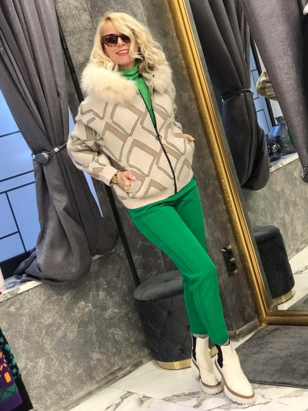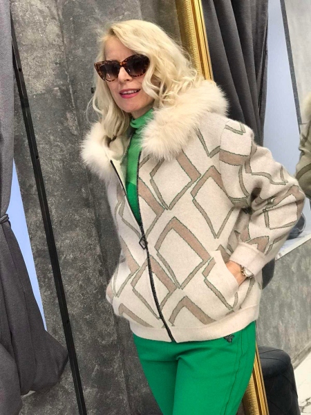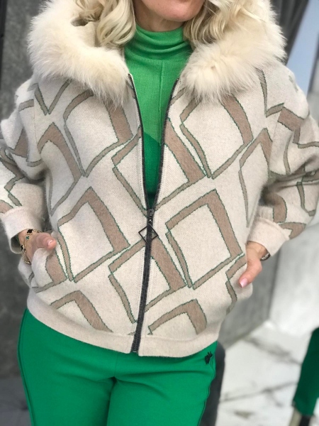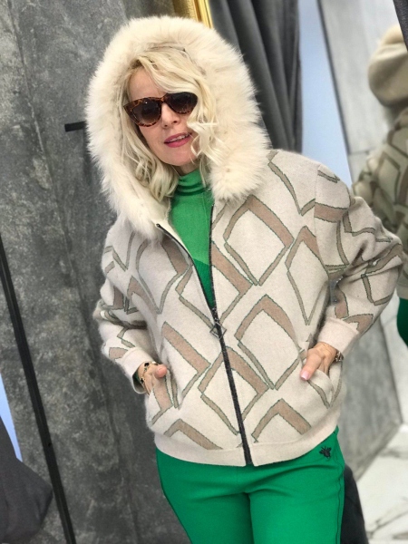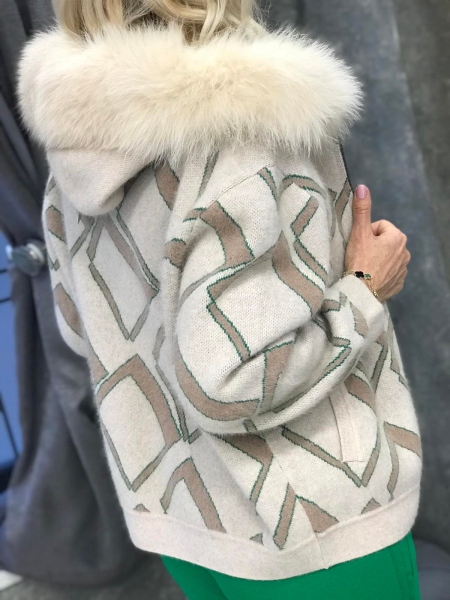 Жилетка от кашмирена материя в с качулка декорирана с естествен косъм. Моделът е със свободен силует и се закопчава с метален цип. Размерът е универсален и е подходящ за S, M, L.