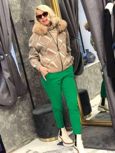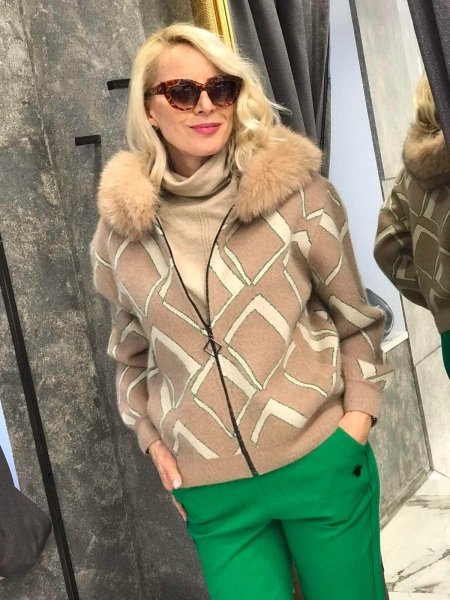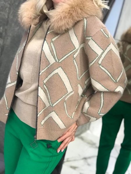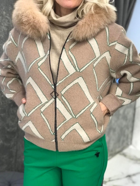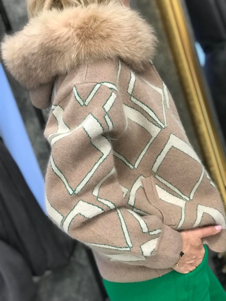 Жилетка от кашмирена материя в с качулка декорирана с естествен косъм. Моделът е със свободен силует и се закопчава с метален цип. Размерът е универсален и е подходящ за S, M, L.