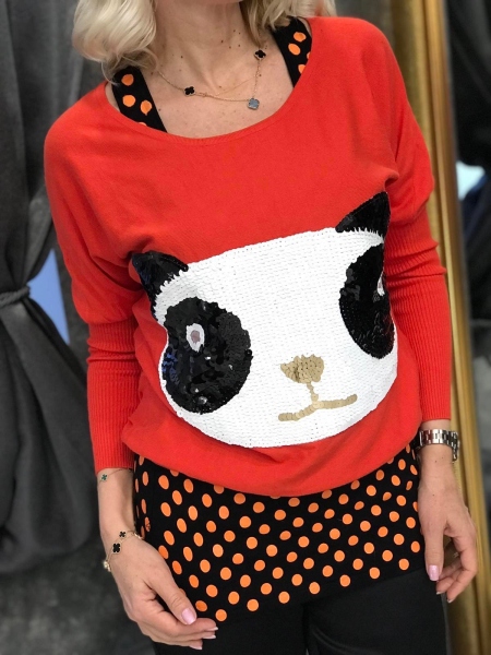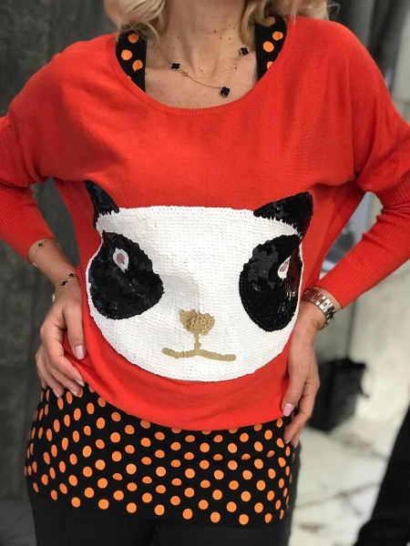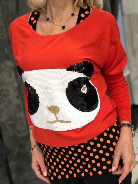 Пуловер от фино плетиво със свободен силует и декорация от пайети. Долната част е топ по тялото. Размерът е универсален и е подходящ за S, M.