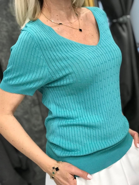 Блуза с остро деколте в лазурен цвят