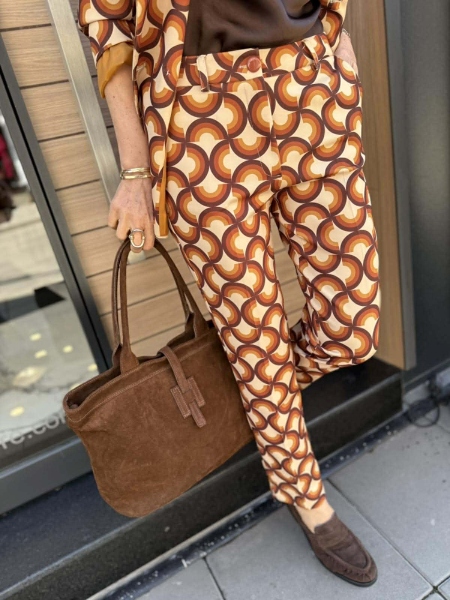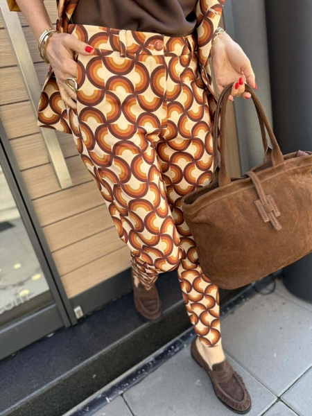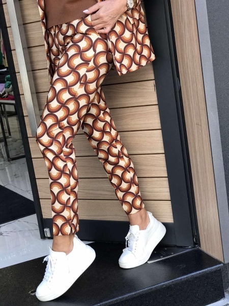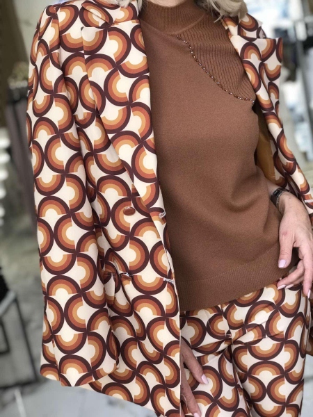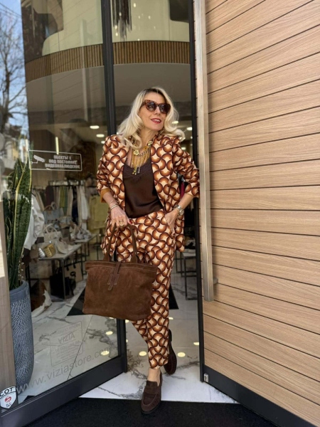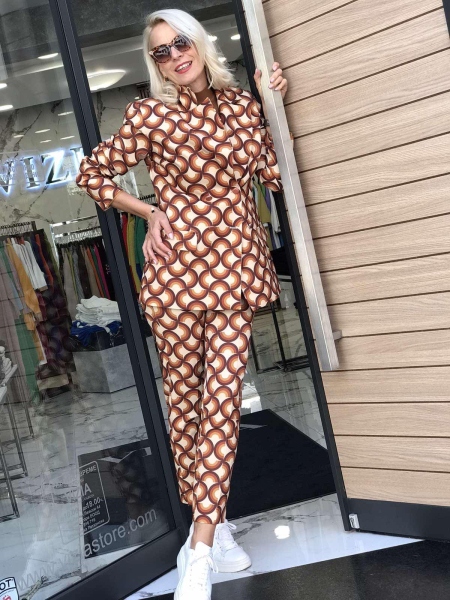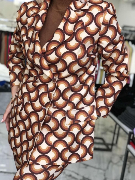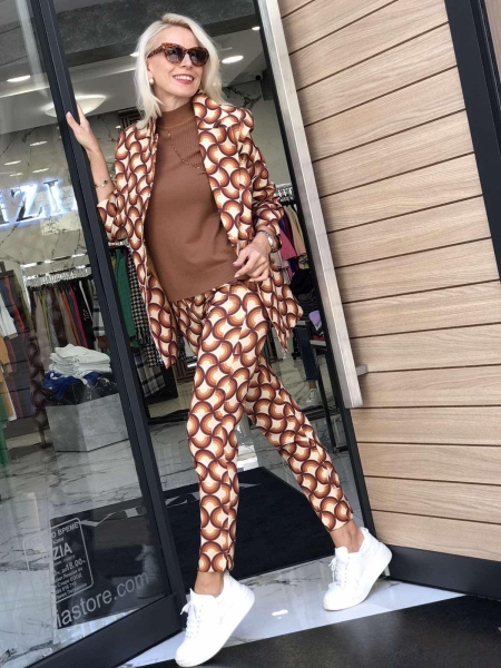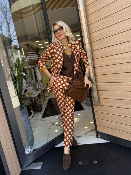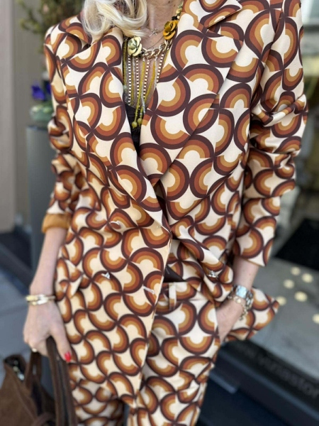 Комплект от сако и панталон с цветен десен. Сакото е с втален силует и се закопчава с копчета. Панталонът е със силно втален силует.