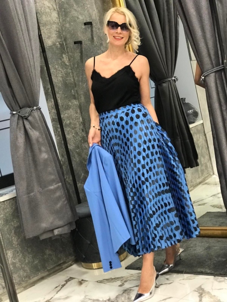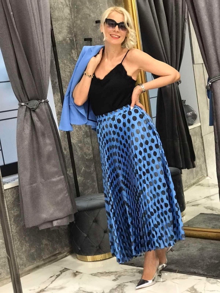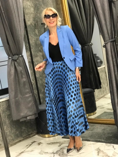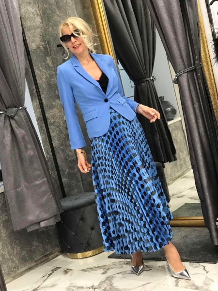 Комплект в син цвят от сако, топ и пола. Сакото е с втален силует и ръкава е 7/8. Топът е с тънки презрамки и свободен слует. Полата е дълъг солей и е на ластик в талията.