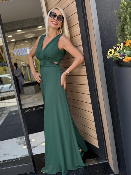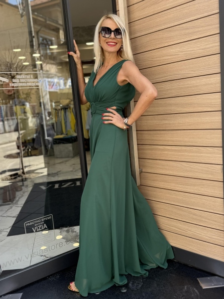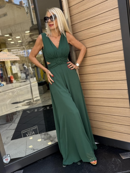 Гащерозон в зелен цвято от ефирна материя. Моделът е с втален силует и много широки крачоли. Закопчава се с цип.
