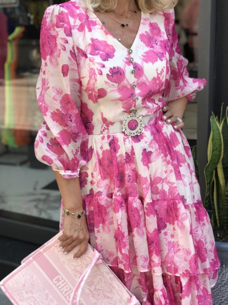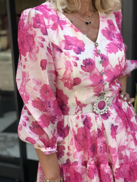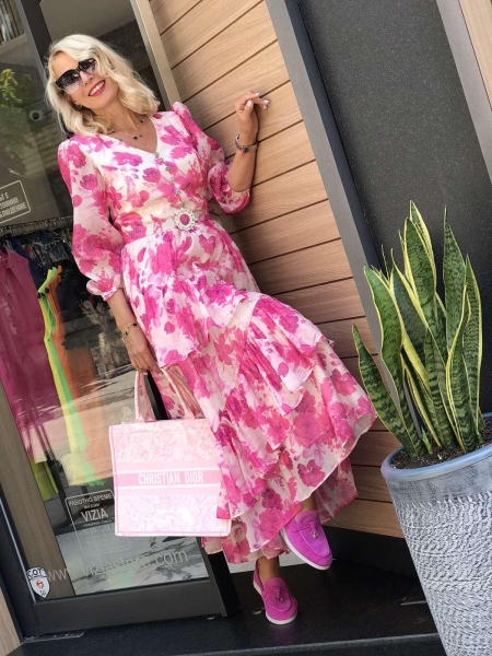 Дълга рокля от шифонена материя с остро деколте. Моделът е с шев на талията и се закопчава с цип. Роклята има подплата.