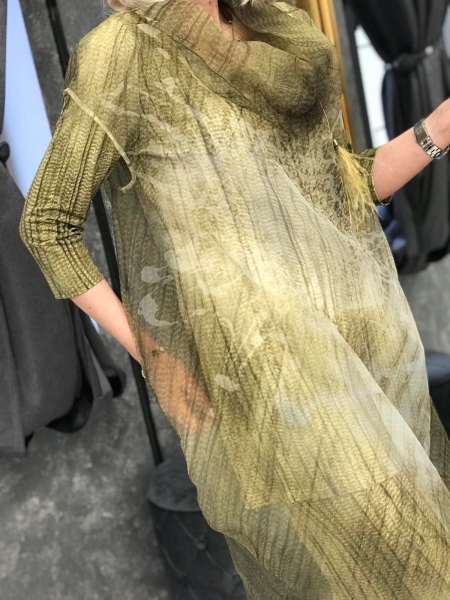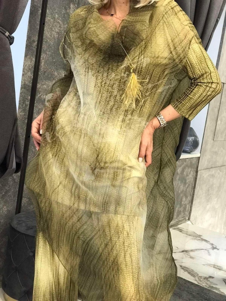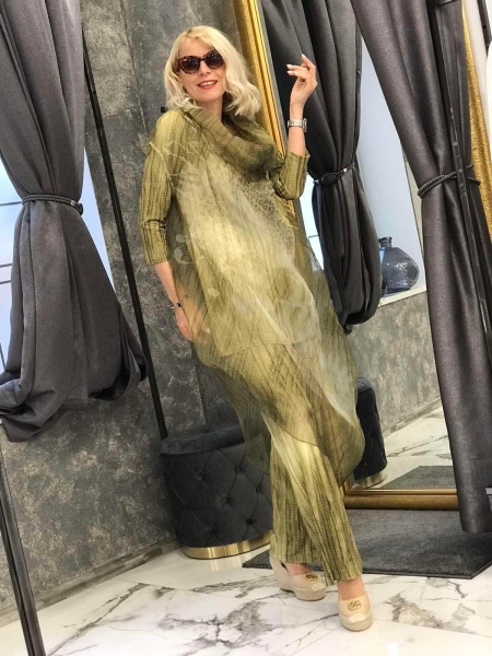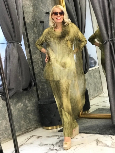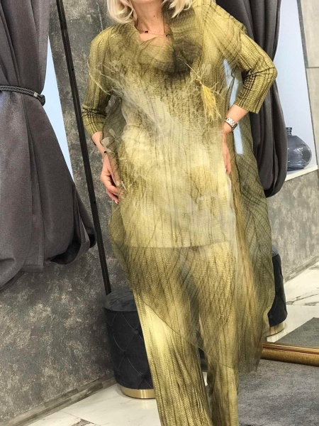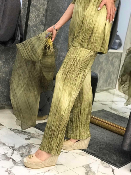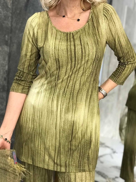 Комплект туника и панталон в зелени нюанси. Горната част е от две части моделът е със свободен силует. Панталонът е с ластик в талията и има широки крачоли.
