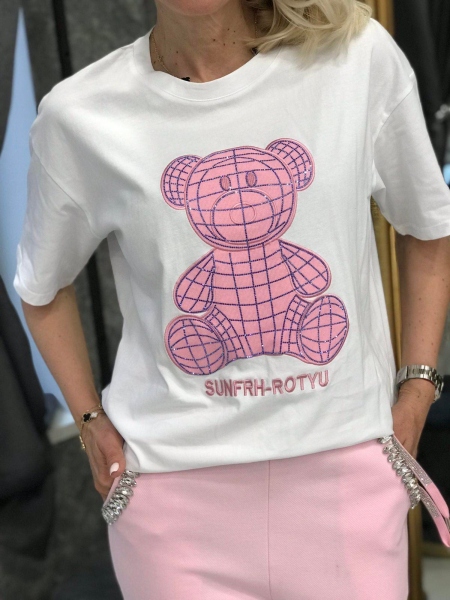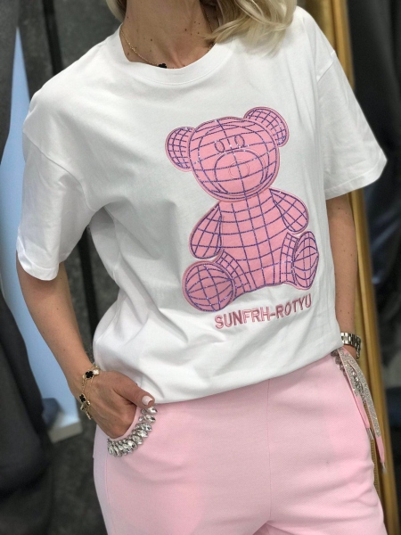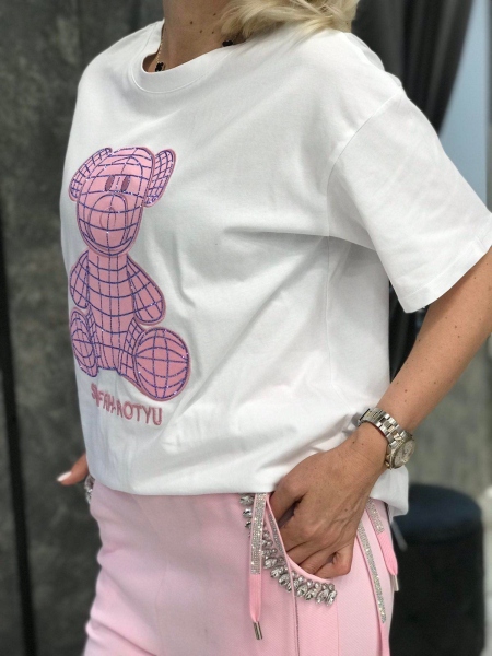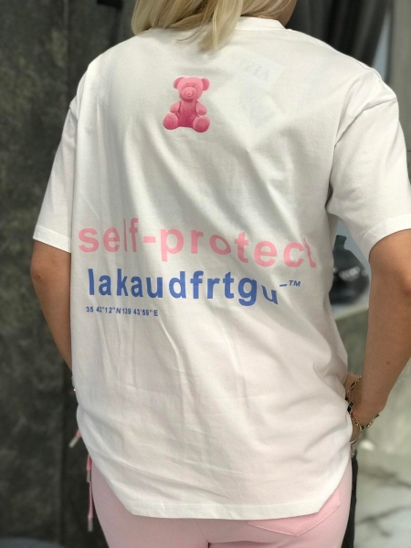Тениска в бял цвят от трикотажна материя. Моделът е със свободен силует. Размерът е универсален и е подходящ за M, L.