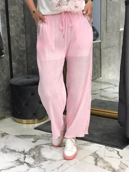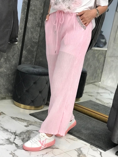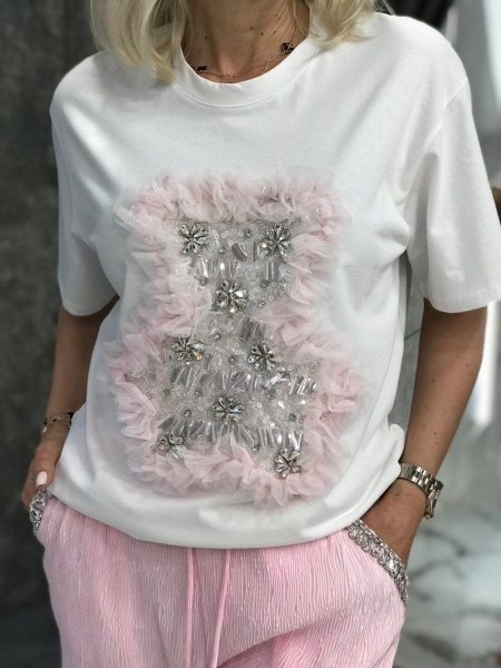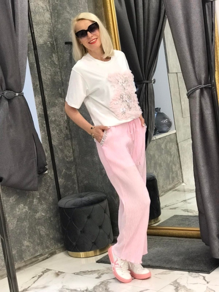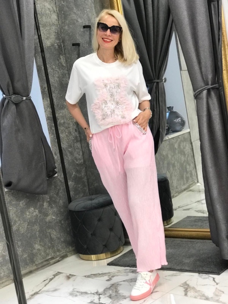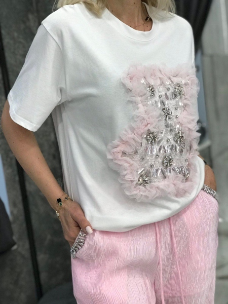 Комплект от тениска и панталон в розов цвят с декорации. Тениската е от памучна материя със свободен силует. Панталонът е с ластик в талията и свободни крачоли. Размерът е универсален и е подходящ за S, M.