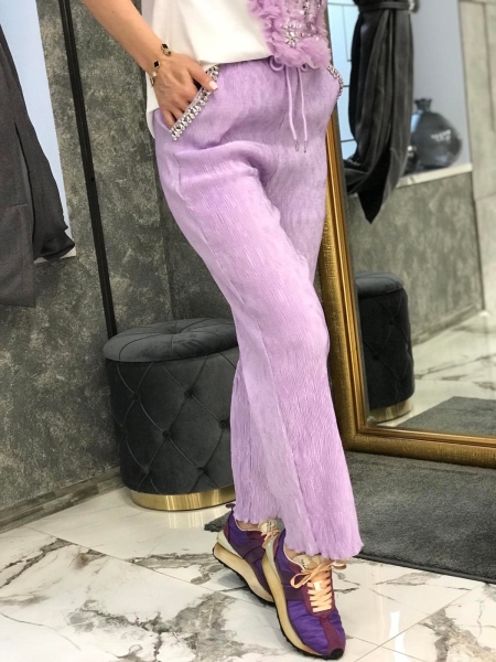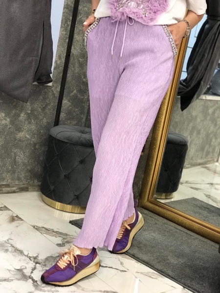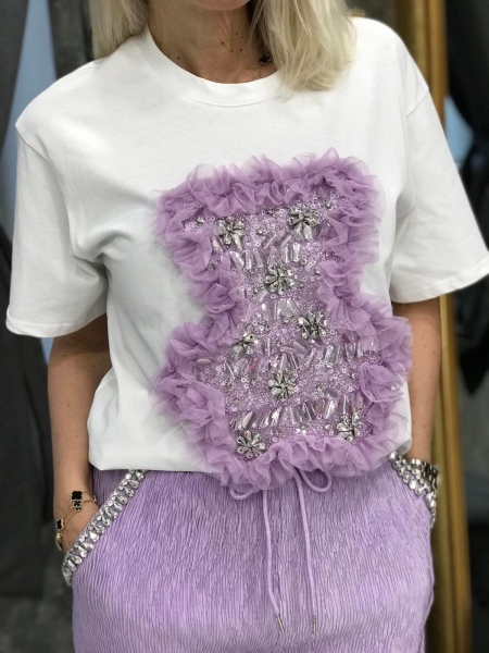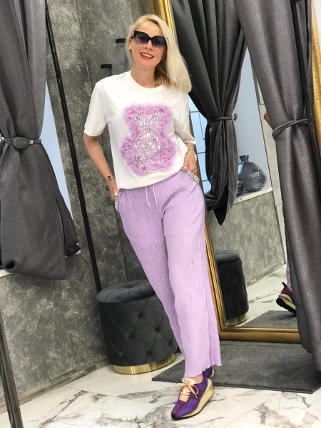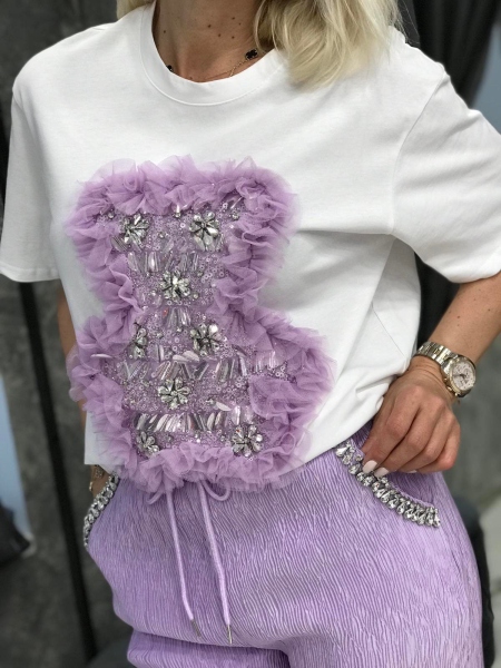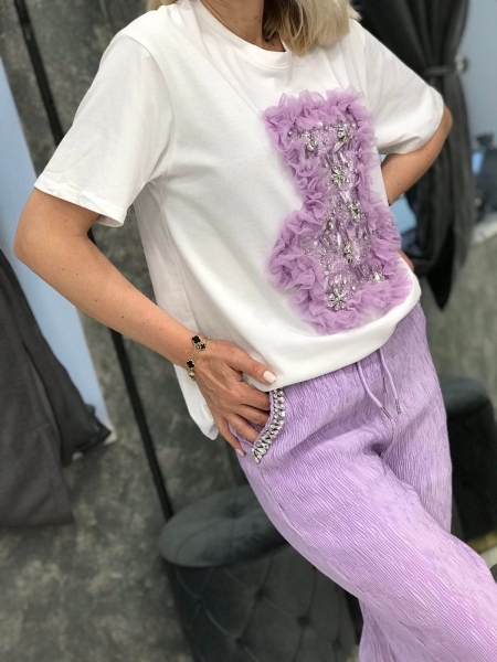 Комплект от тениска и панталон в лилав цвят с декорации. Тениската е от памучна материя със свободен силует. Панталонът е с ластик в талията и свободни крачоли. Размерът е универсален и е подходящ за S, M.