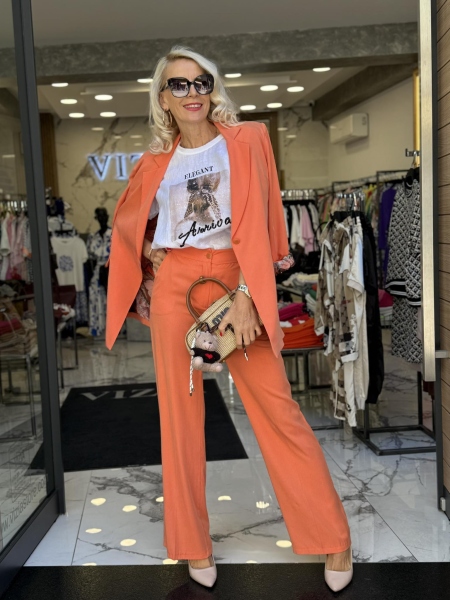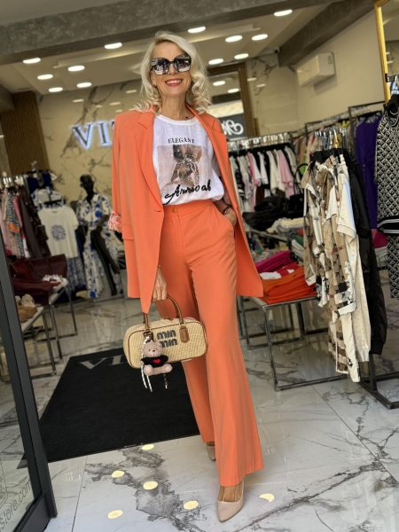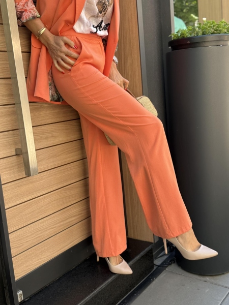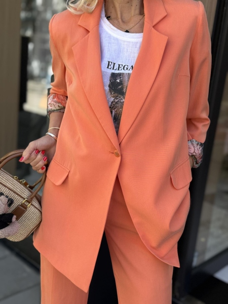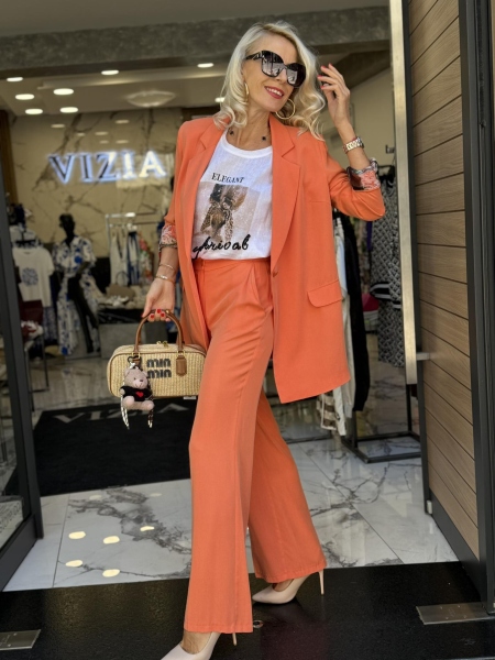 Комплект сако с панталон от фина материя. Сакото е със свободен силует и има ефектна подплата. Панталонът е с висока талия и свободни крачоли.