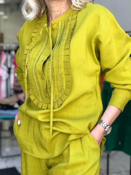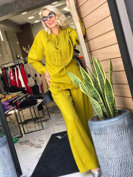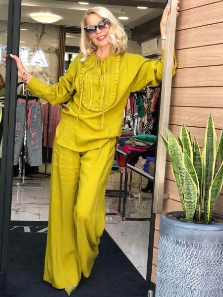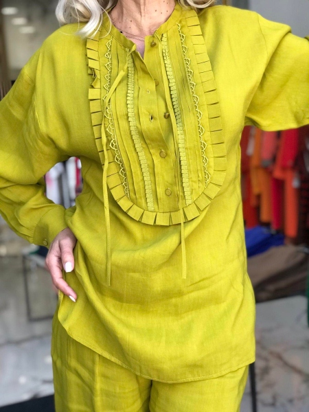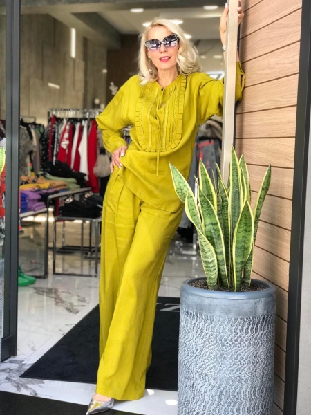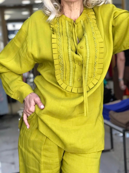 Комплект риза и панталон в наситен цвят. Ризата е със свободен силует и се закопчава в предната си част с копчета. Панталонът е с широки крачоли и се закопчава с цип и копче.