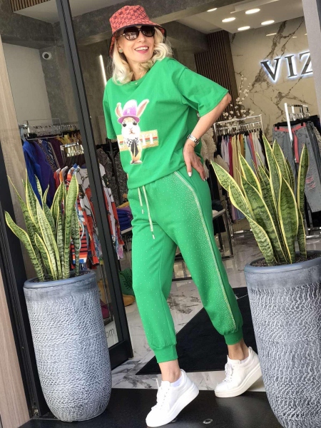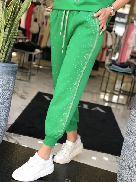 Панталон в наситен зелен цвят с декорация от камъчета по него. Моделът е с ластик в талията и краищата на крачолите. Размерът е универсален и е подходящ за S, M, L.