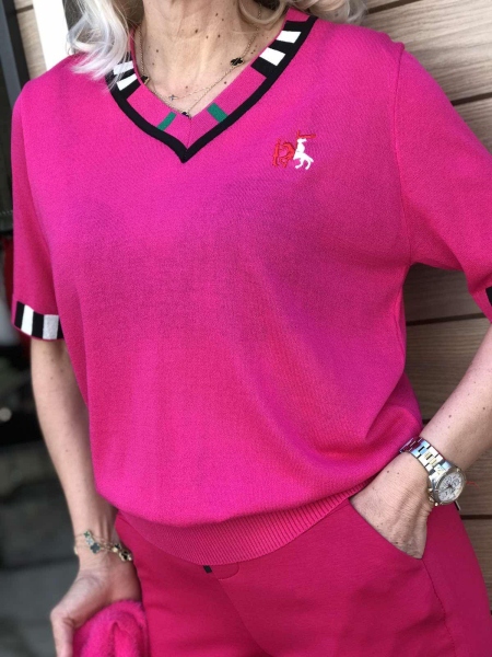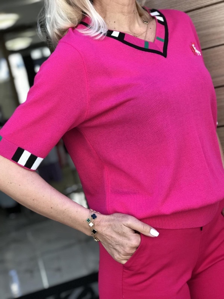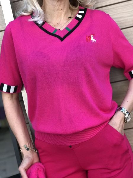 Блуза от фино плетиво в цикламен цвят със свободен силует. Моделът е универсален размер.