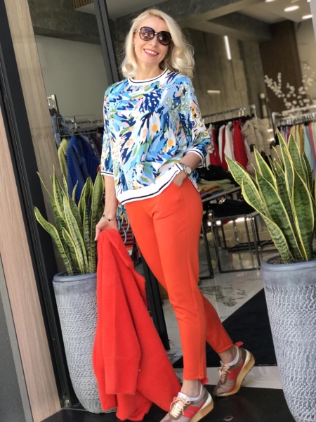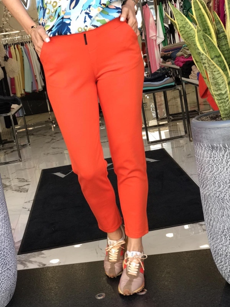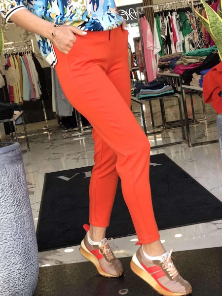 Ежедневен панталон от мека трикотажна материя в наситен оранжев цвят. Моделът е с ластик в талията и има странични джобове.