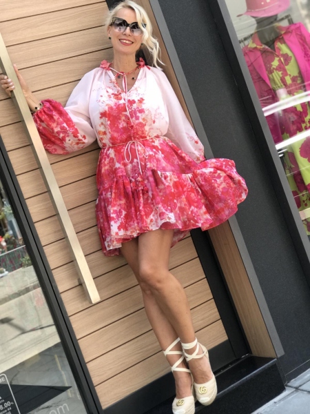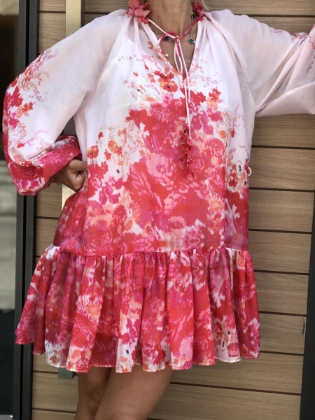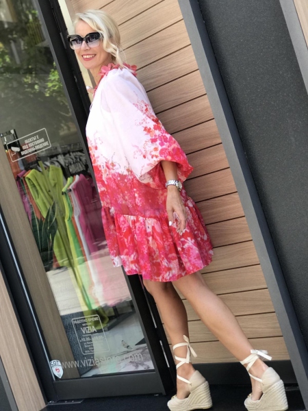 Къса рокля с напълно свободен силует. Моделът се облича без закопчаване. Към роклята има подвижна подплата.