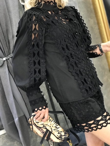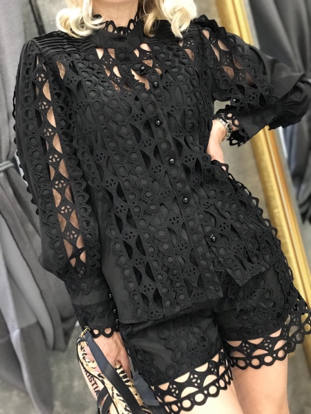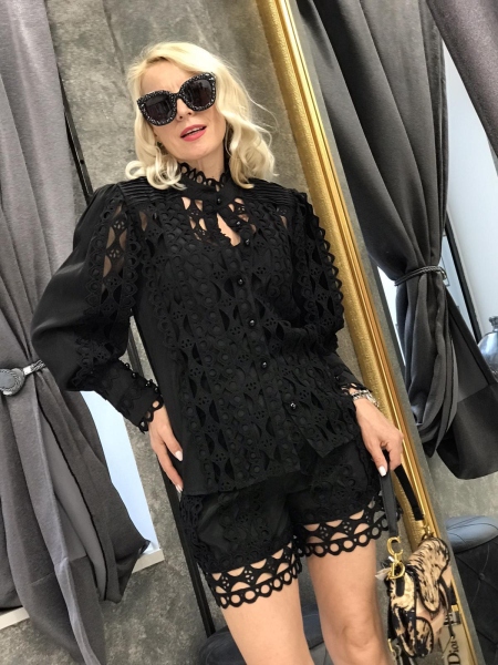Комплект риза с къси панталони в черен цвят. Ризата е със свободен силует и към нея има топ. Късите панталони са с висока талия и се закопчават с цип.