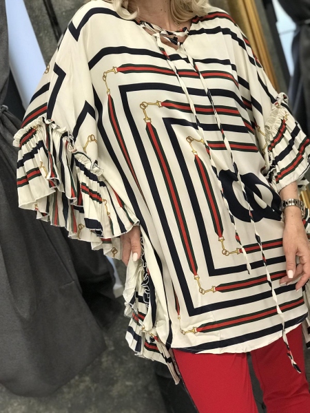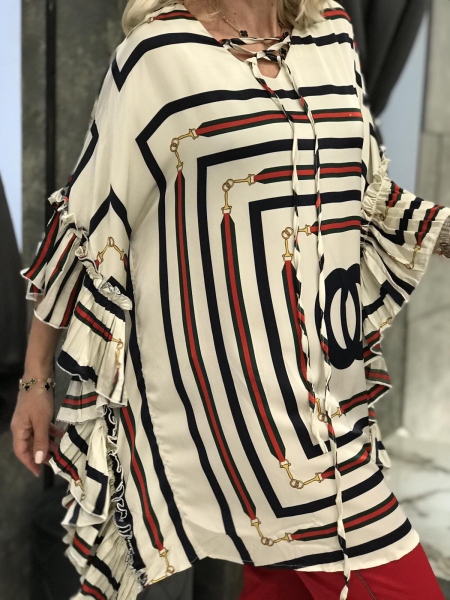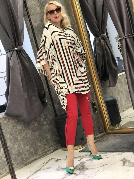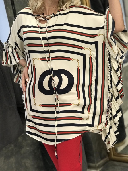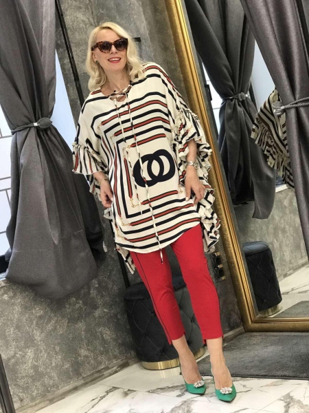 Туника от тънка материя с цветен десен. Моделът е с напълно свободен силует. Размерът е универсален и е подходящ за L, XL, XXL.