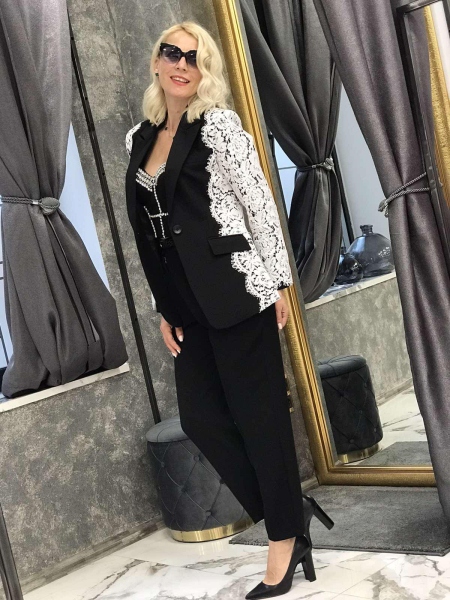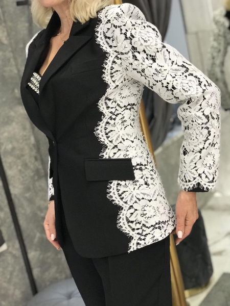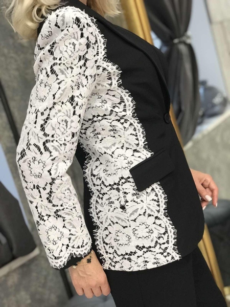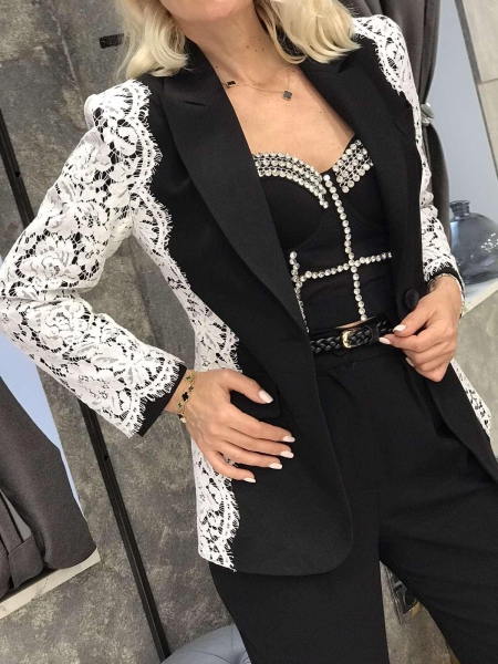 Сако в черен цвят с декорация от бяла дантела. Моделът е с втален силует и се закопчава с едно копче.