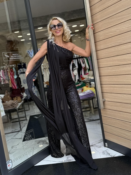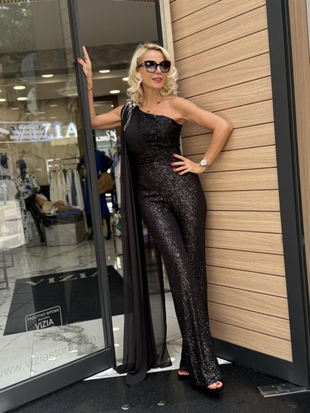 Гащеризон с втален силует изцяло декориран с пайети. Моделът е с шев на талията и се закопчава с цип.