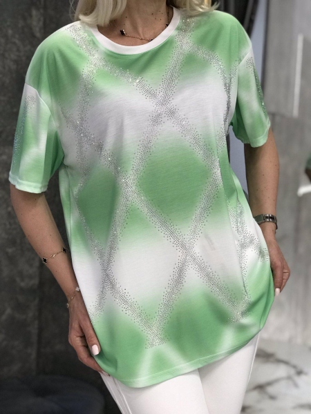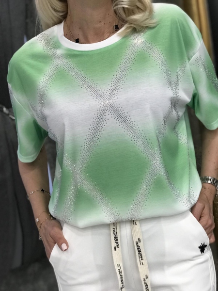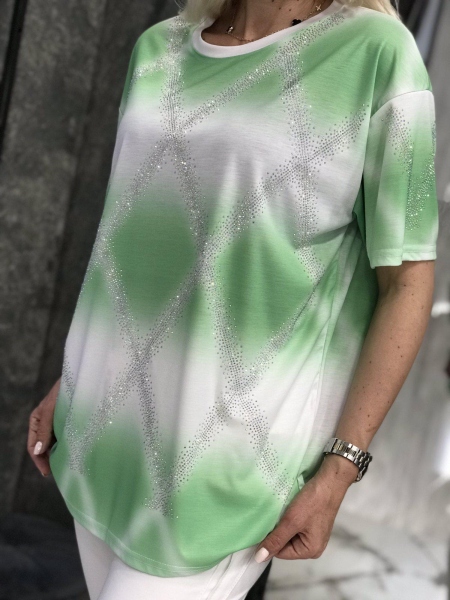 Свободна тениска в бяло и зелено с декорация от камъчета. Моделът е универсален размер и е подходящ за M, L, XL.