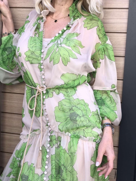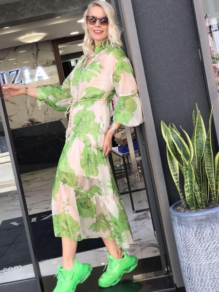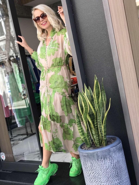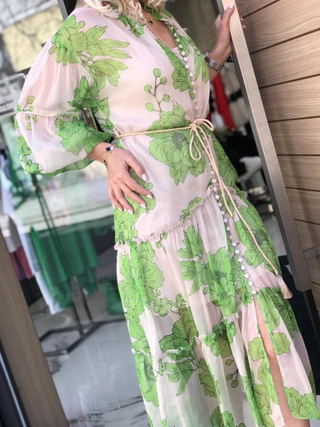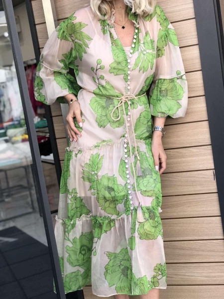 Рокля от фина шифонена материя с дължина под коляното. Моделът се закопчава с копчета. Към нея има подвижна подплата.