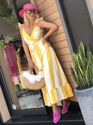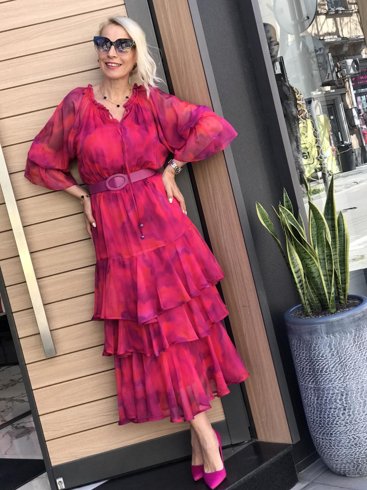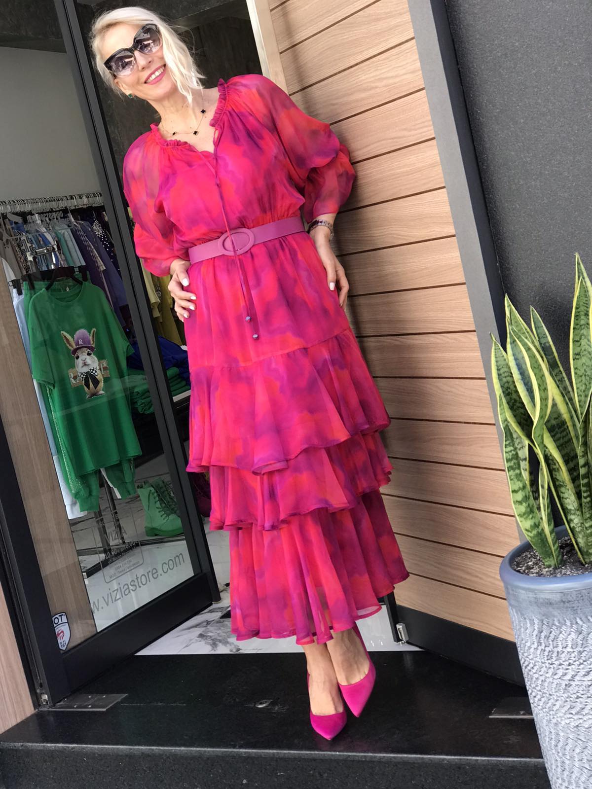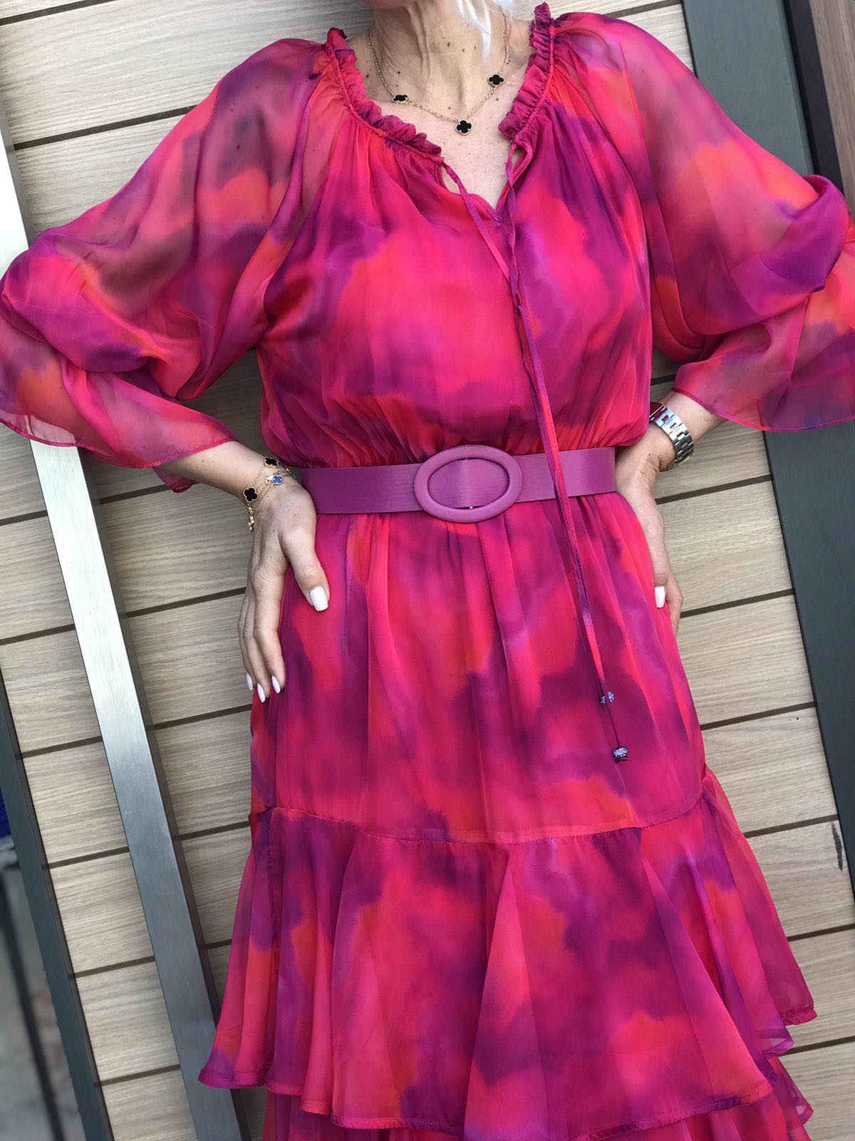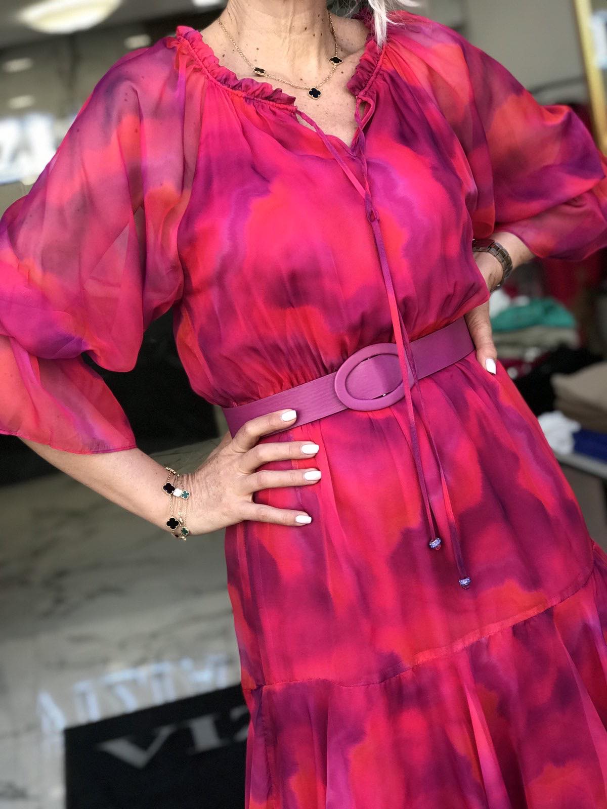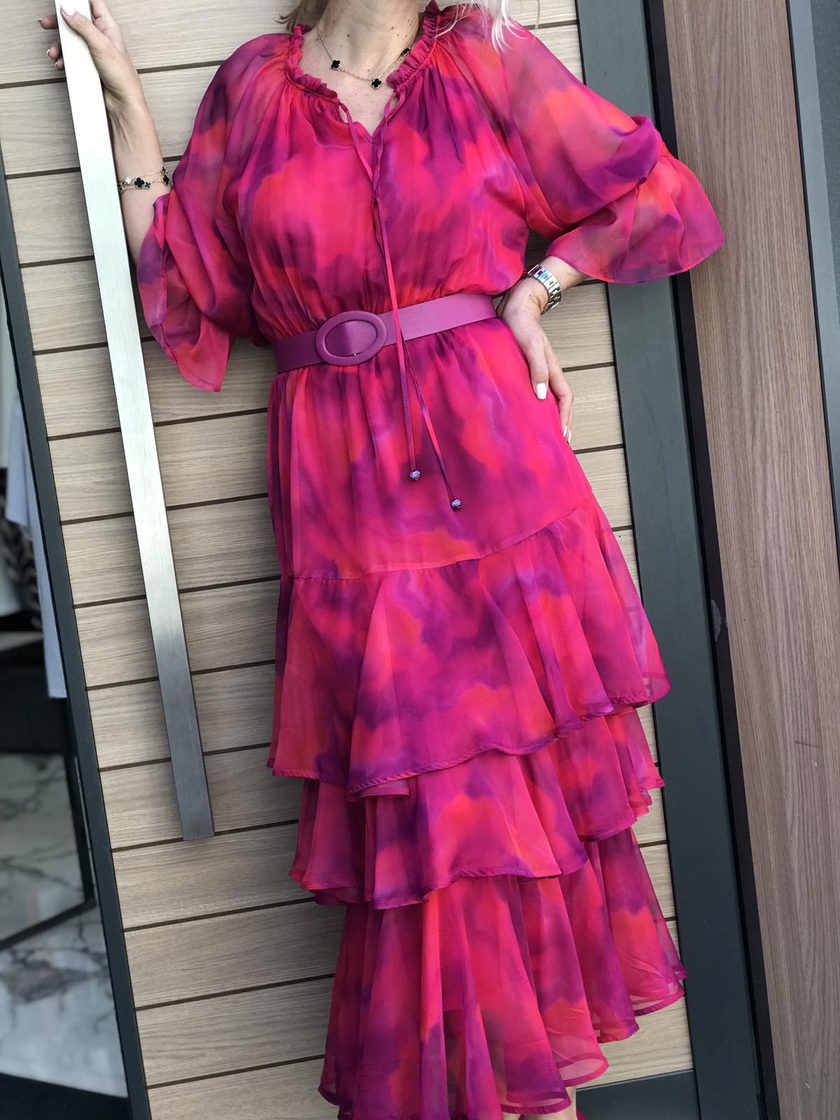 Дълга шифонена рокля с свободни ръкави. Моделът е с ластик в талията и се облича без закопчаване. Към нея има аксесоар колан.