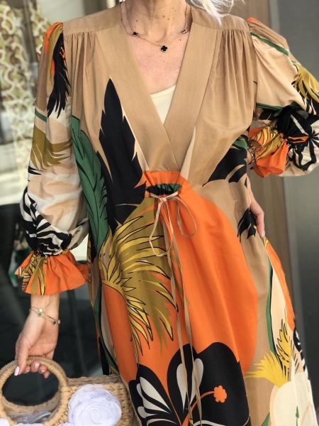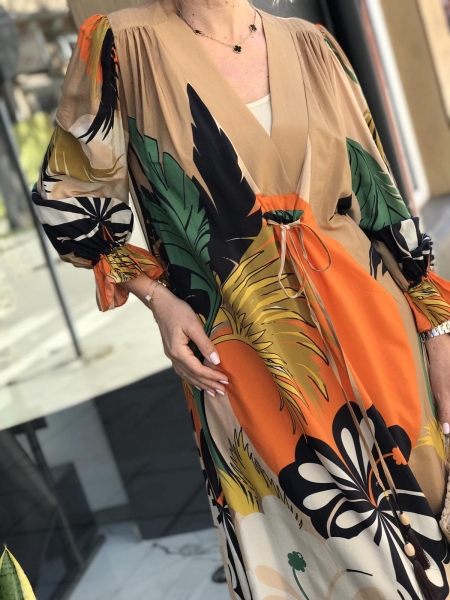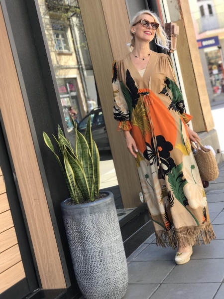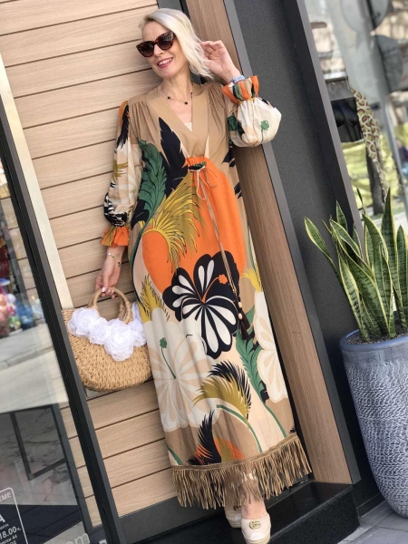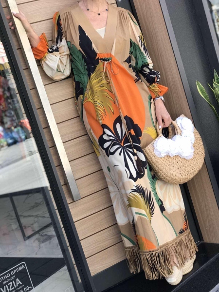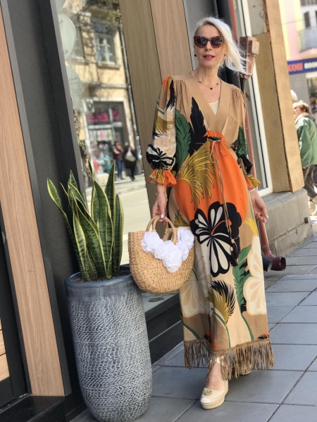 Дълга рокля със свободен силует от тънка материя. Моделът се облича без закопчаване. Към нея има подвижна подплата.
