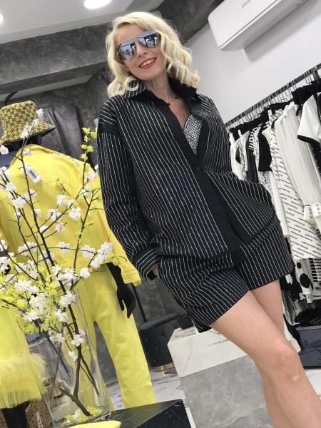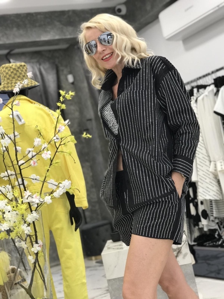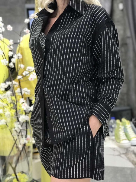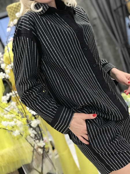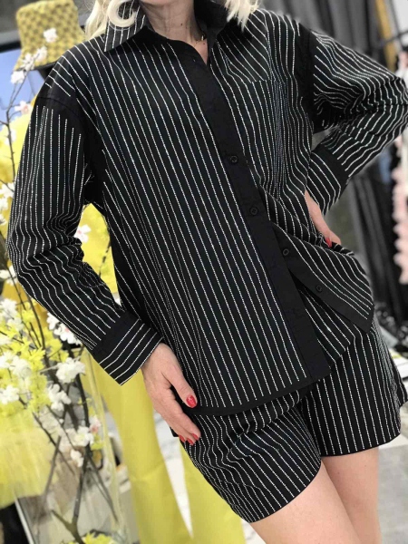 Комплект риза с къси панталони черен цвят. Ризата е със свободен силует и се закопчава с копчета. Панталоните са с ластик в талията.