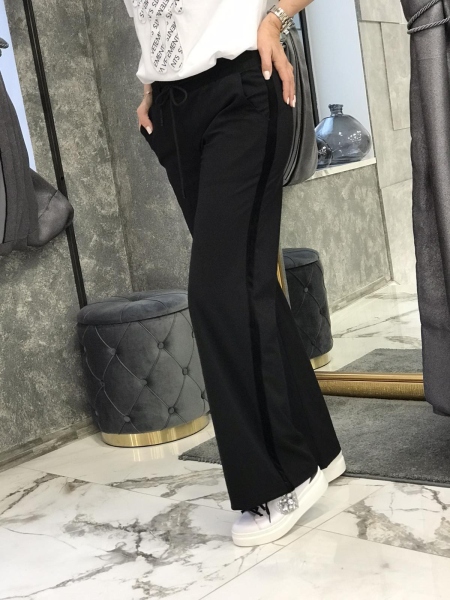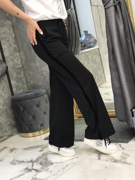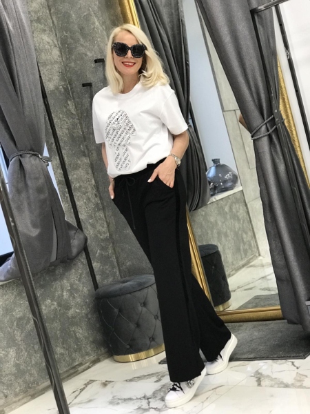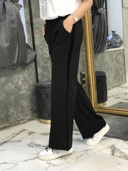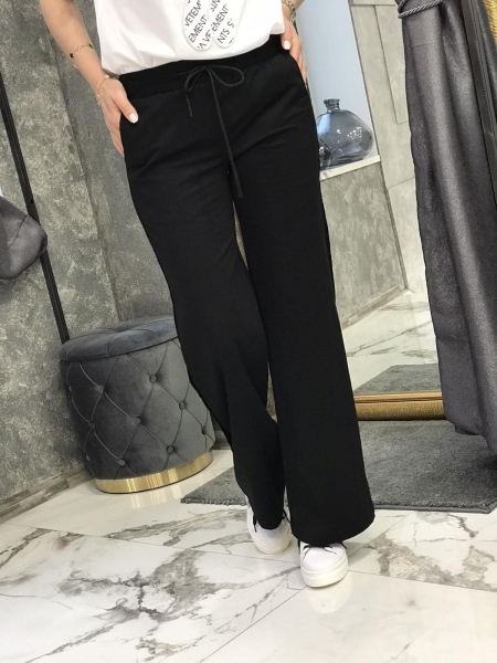 Панталон с изчистен дизайн и широки крачоли. Моделът е с ластик в талията и има странични джобове.