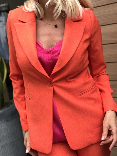 Комплект сако и панталон в наситен оранжев цвят. Сакото е с втален силует и се закопчава с едно копче. Панталонът е с ластик в талията и стесняващи се крачоли.