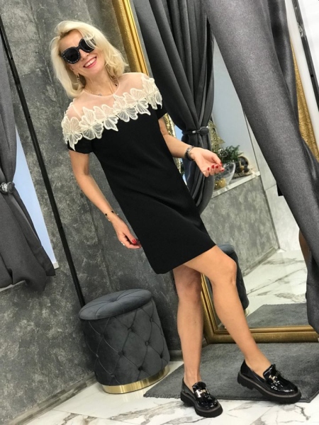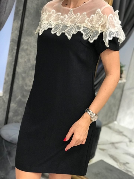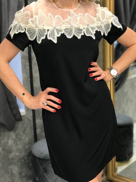 Къса рокля в черен цвят с декорация от бежов тюл на рамената. Моделът е със свободен силует и се закопчава с цип.