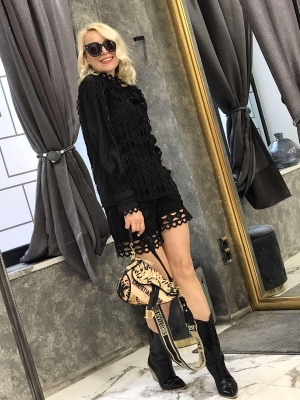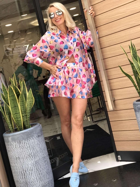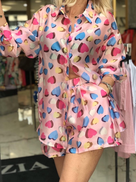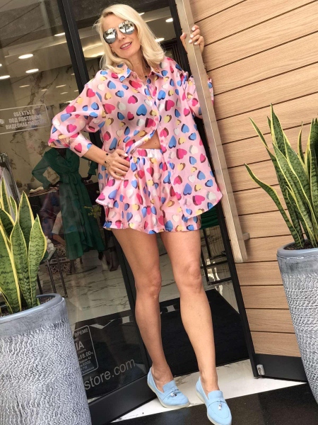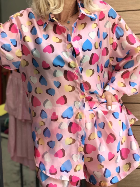 Комплект риза с панталон от фина материя. Ризата е с напълно свободен силует. Панталоните са с ластик в талията и имат странични джобове. Размерът е универсален и е подходящ за S/M.