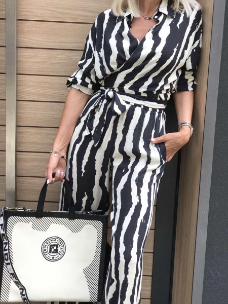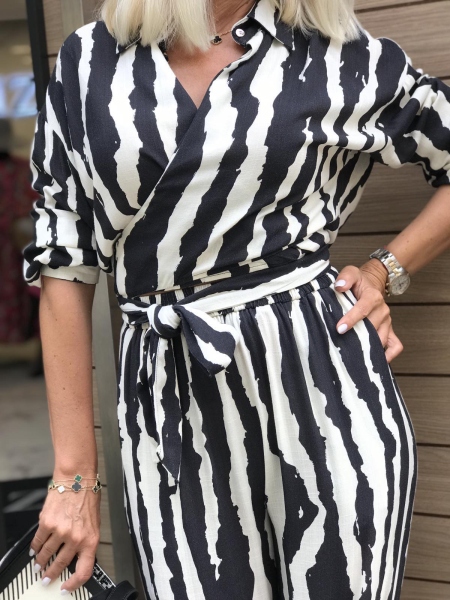 Ленен комплект панталон и скъсена блуза с животински принт. Блузата е с прехвърляне без ципове само със завързване. Панталонът е с ластик в талията и дълги широки крачоли.