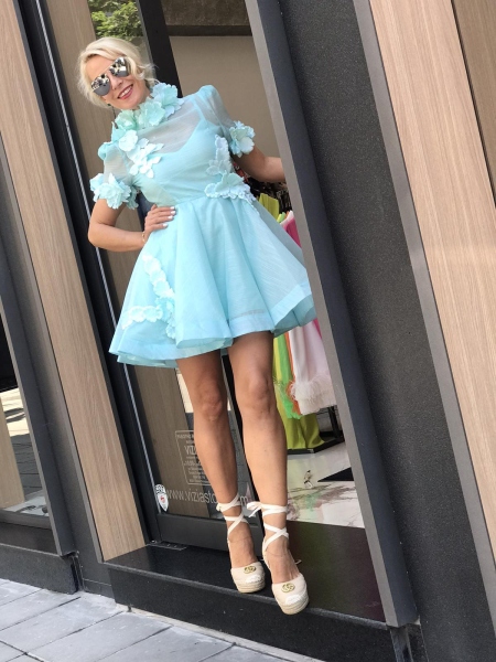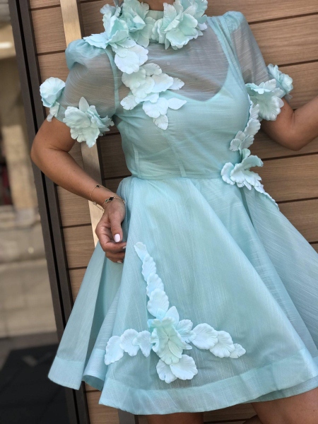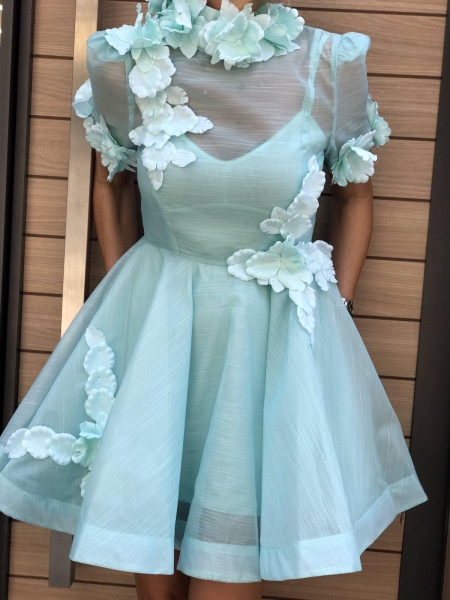 Рокля с дължина над коляното с шев на талията и къс ръкав. Моделът се закопчава с цип и към него има подвижна подплата.