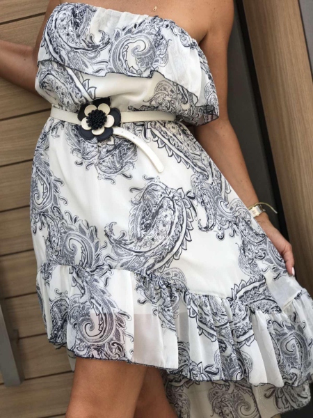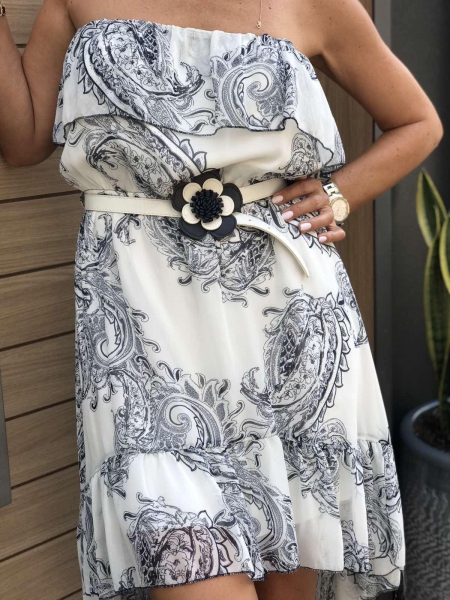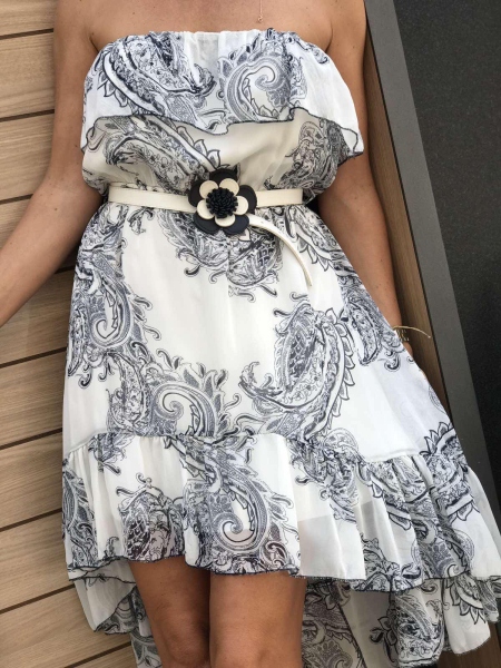 Рокля тип бюстие от ефирна материя. Моделът има ластик на бюста и талията и се облича без закопчаване. Към нея има и аксесоар колан.