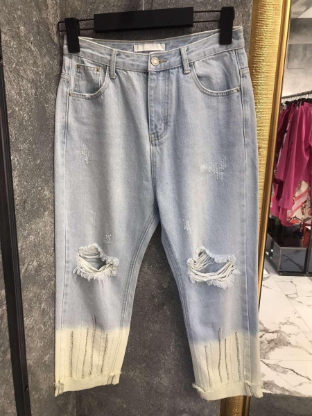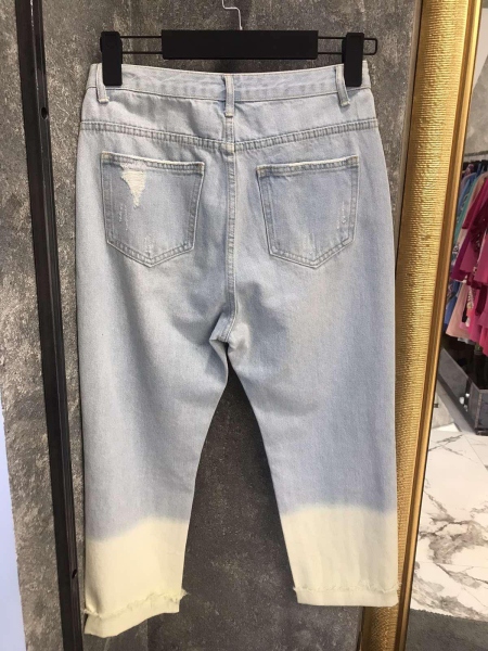 Дънки от светъл деним с изтъркани детайли. Моделът се закопчава с цип и копче.