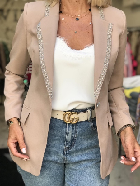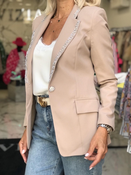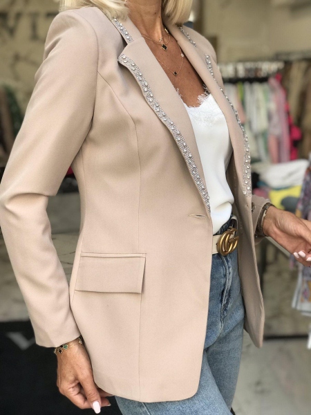 Елегантно сако с втален силует и детайли с камъни на ревера. Акцент в закопчаването е копче-брошка. Може да придаде и официален нюанс на визията ви.