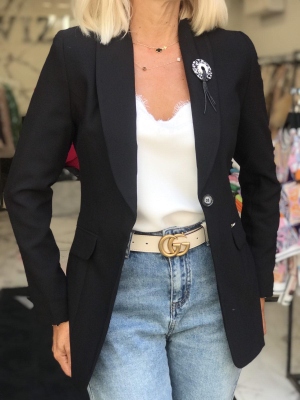 Елегантно сако с втален силует и детайли с камъни на ревера. Акцент в закопчаването е копче-брошка. Може да придаде и официален нюанс на визията ви.