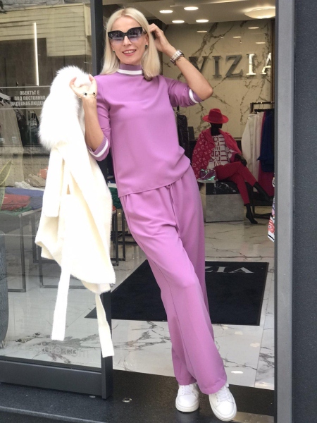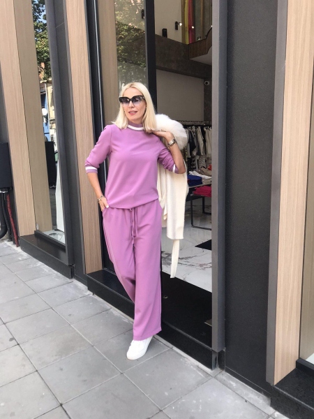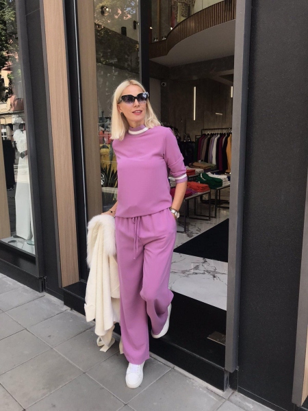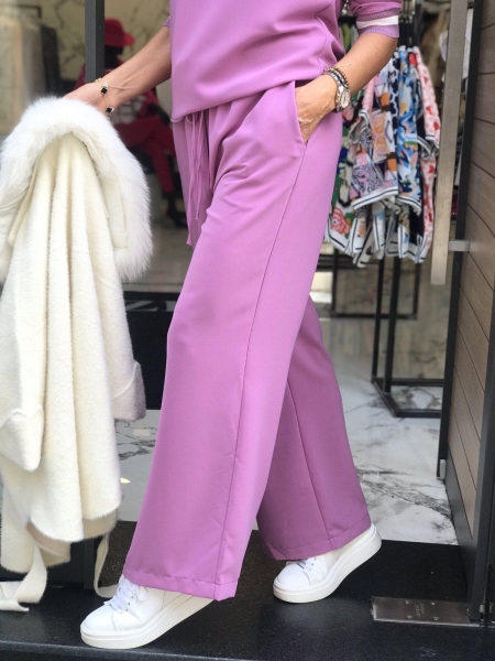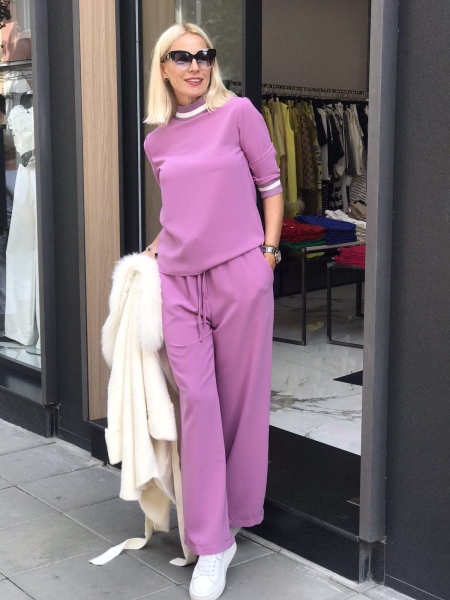 Спортно-елегантен комплект подходящ за ежедневна визия. Широкият панталон създава удобство и комфорт. Блузата е със свободен силует и има ластик на деколтето и на ръкавите.