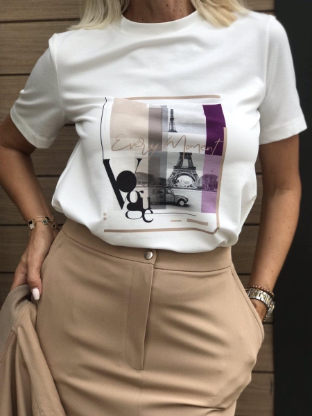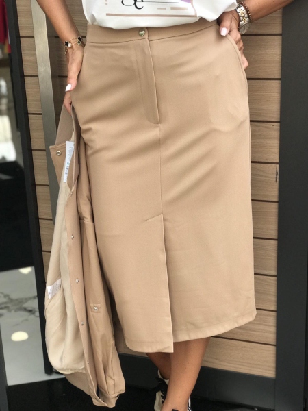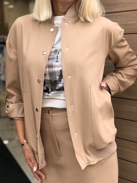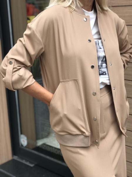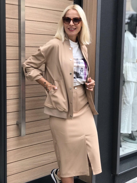 Комплектът съдържа бомбър яке, блуза с щампа и пола с миди дължина. Якето може да се носи със 7/8 ръкав.