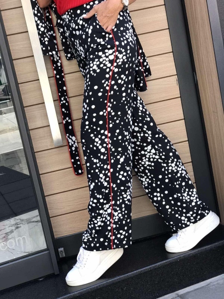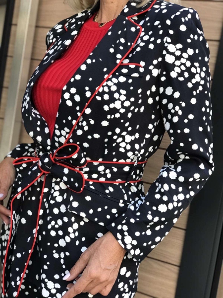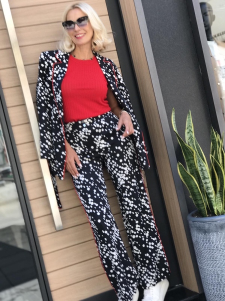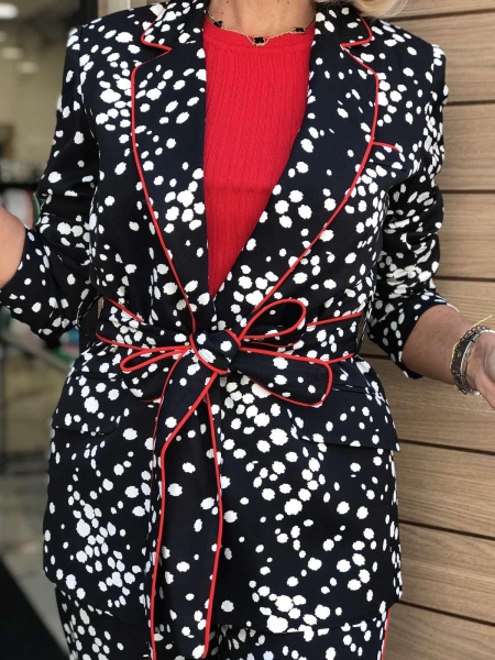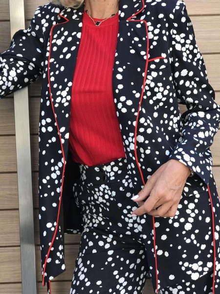 Комплект сако с панталон в черно на бели точки. Горната част е сако без закопчаване. Към него има колан за втален силует. Панталонът е с фиксирана талия и свободни крачоли.